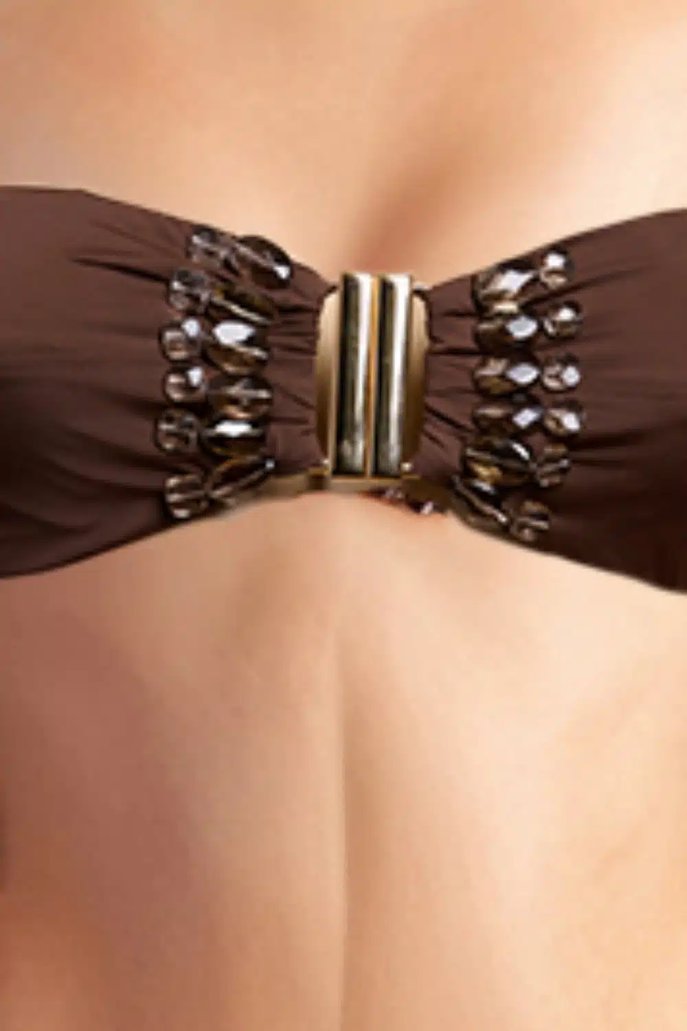 Coffe swimsuit, made from 100% biodegradable polyamide and hand embroidered with natural facete bronzite gemstones (the color of the fabric will be the same and the embroidered surface too, however the tone of the fabric may have a small variation as well as the shape & tone of the gemstones, depending of the stock available on the market).